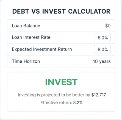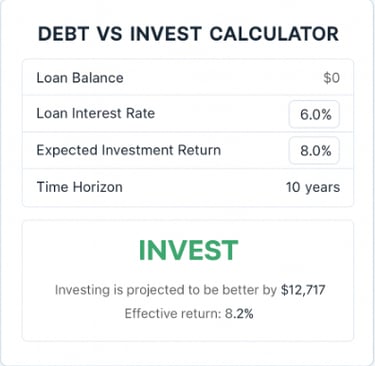 A free, beginner-friendly calculator that shows you—step by step—whether your money should go toward debt repayment or investing, based on your real numbers.